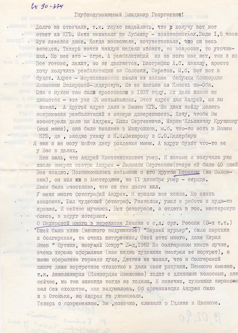 Долго не отвечала, т.к. глупо надеялась, что получу вот вот ответ из КГБ. Меня вызывали на Лубянку - познакомиться. Была 1,5 часа. Муж извелся дома. Когда позвонила, почувствовала, что он весь заведен. Теперь почти каждую неделю звонят, то вопросик, то уточнения. Но все это - игра. А реабилитация ни на кого как нет, так и нет. Все готово, лежит, но не двигается. Биографию А. С. напишу, просто хочу получить реабилитацию за Соловки, Саратов. М.б. вот вот и будет. Адрес - Мартиановская взяла из письма бабушки Конкордии Ивановны Захаровой-Цедербаум. Из ее письма из Камень на-Оби. Она с мужем там были арестованы в 1937 году. Их дело никак не движется - это уже ЦК меньшевиков. Этот адрес дал Андрей, он им писал. А другой адрес дали в Вашем КГБ. На днях пойду делать ксерокопии реабилитаций и заверю доверенность. Хочу, чтобы Вы посмотрели дела на Андрея, Юлия Сергеевича, Марию Ильиничну Крупнову (моя мама), она была выслана в Минусинск, м.б. что-то есть в Вашем КГБ, да, заодно укажу и К.И. Захарову и С.О. Цедербаум