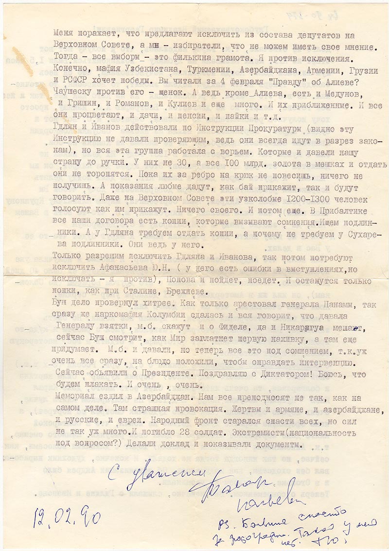 Меня поражает, что предлагают исключить из состава депутатов на Верховном Совете, а мы - избиратели, что не можем иметь свое мнение. Тогда - все выборы - это филькина грамота. Я против исключения. Конечно, мафия Узбекистана, Туркмении, Азербайджана, Армении, Грузии и РСФСР хочет победы. Вы читали за 4 февраля «Правду» об Алиеве? Чаушеску против него - щенок. А ведь кроме Алиева, есть и Медунов, и Гришин, и Романов, и Кулиев и еще много. И их приближение. И все они процветают, и дачи, и пенсии, и пайки и т.д.