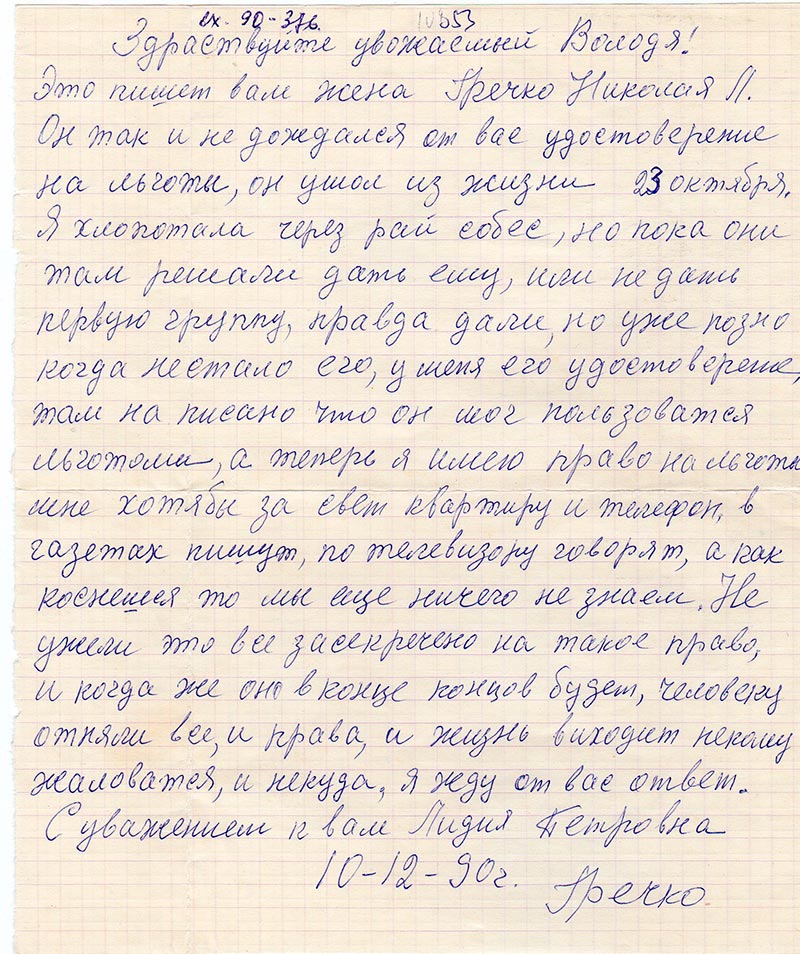 Это пишет вам жена Гречко Николая Л. Он так и не дождался от вас удостоверение на льготы, он ушол из жизни 23 октября. Я хлопотала через рай собес, но пока они там решали дать ему, или не дать первую группу, правда дали, но уже поздно когда не стало его, у меня его удостоверение, там написано что он мог пользоваться льготами, а теперь я имею право на льготы мне хотябы за свет квартиру и телефон, в газетах пишут, по телевизору говорят, а как коснешься то мы еще ничего не знаем. Не ужели это все засекречено на такое право, и когда же она в конце концов будет, человеку отняли все, и права, и жизнь выходит некому жаловаться, и никуда, я жду от вас ответ.