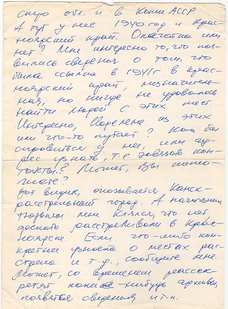 … сообщает, что она с семьей сосланы в 1940 г. Должно быть в «1941». И в тот, 1941г ссылали весь Алтай в Томскую обл. и в Коми АССР. А тут у нее 19420 год и Красноярский край. Опечатка или нет? Мне интересно то, что появились сведения о том, что была ссылка в 1941 г.в Красноярский край, незначительная, но нигде не удовалось найти людей с этих мест. Интересно, … из этих или что-то путает? Как бы справиться у нее, или адрес узнать, т.е. завязать контакты? Может, Вы поможете?