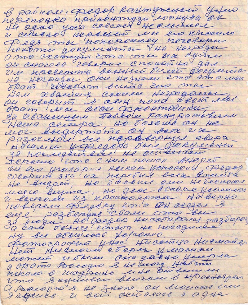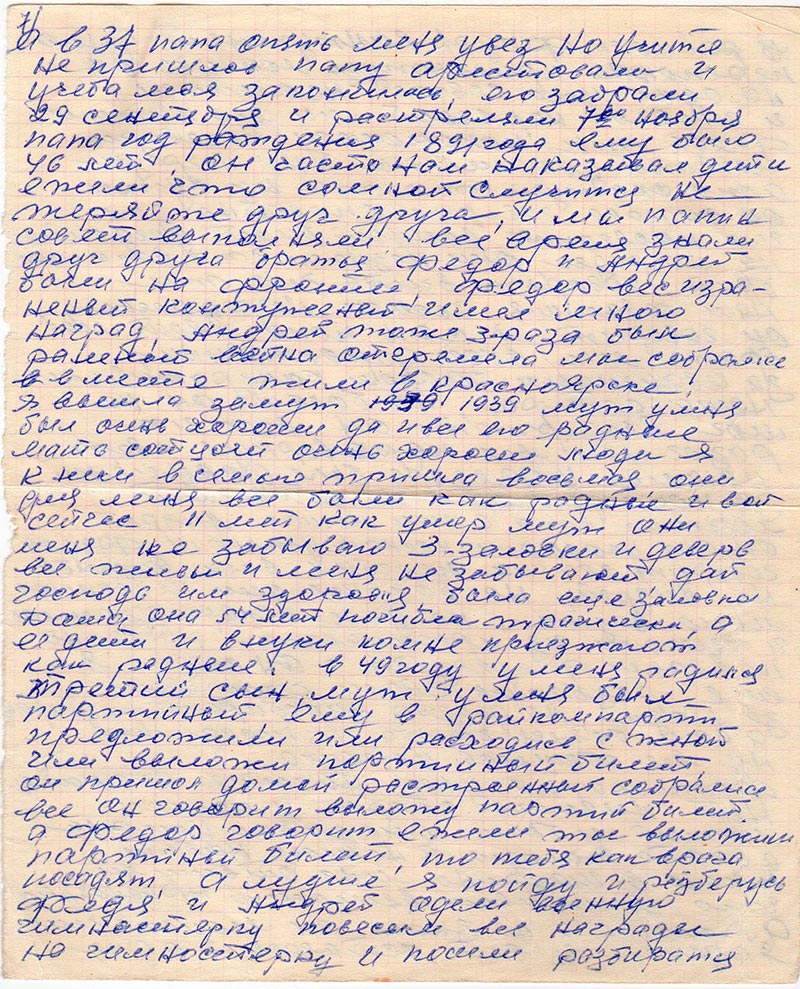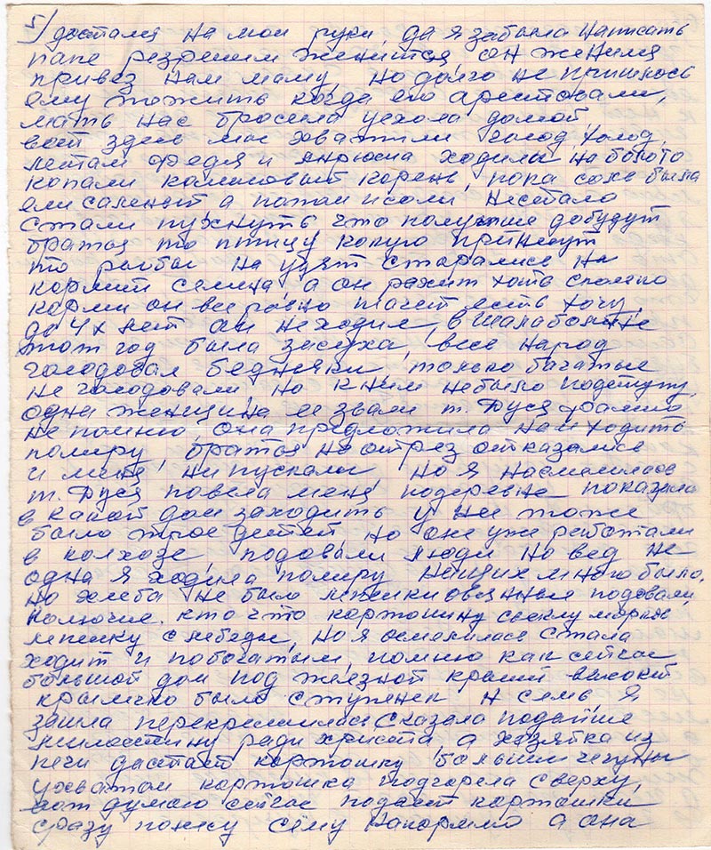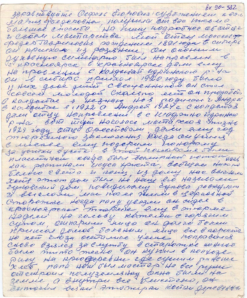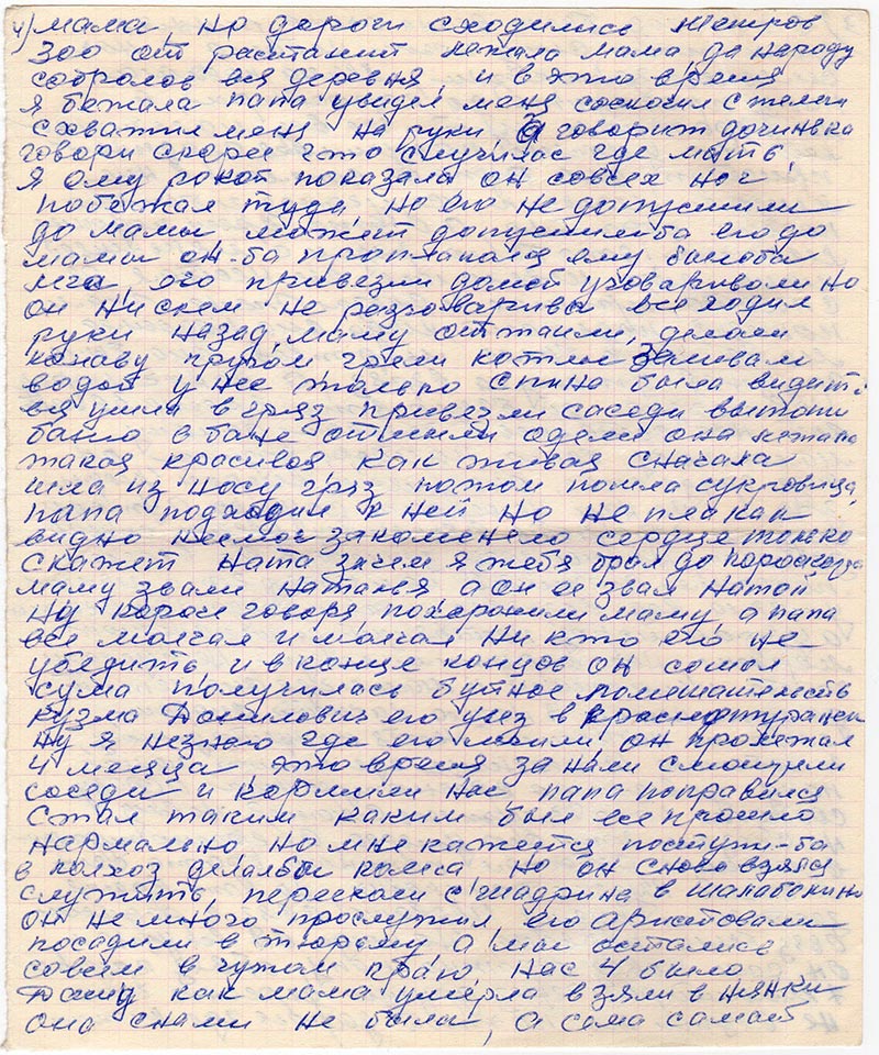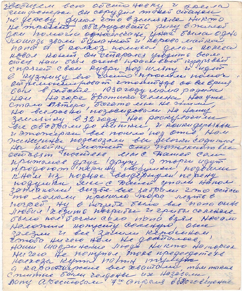 Суважением к вам Мария Федоровна, получила от вас письмо большое спасибо! На пишу подробнее об отце и своем мытарстве, мой отец Моисеев Федор Гаврилович раждения 1891 года в Сибирь он приехал из Рязани, он окончил духовную сименарию, был направлен в г. Красноярск, в Красноярске дали ему на правление с. Колдыбай Идринского р-на он в Сибирь приехал 1920 году было у них двое детей священником он стал совсем молодой . сколько лет он проработал в Колдабае я незная но я родилась и Андрей в Колдабае я с 1922 а Андрей 1924 г. С Колдабая дали отцу направление в с. Шадрино Идринского р-на, вот тут началась мытарская жизнь 1929 году отца арестовали, дали ему год тюремного заключения. Когда он учился в … ему подарили понораму за успехи в учебе! В этой панораме были пластинки когда был всемирный потоп как распинали Исуса Христа, вобщем началого белого света и конец, из дому нас выгнали хотя этот до был не наш, его называли чуковский дом, повидимому Чукова раскулачили и вселили, мы после жили в церковной сторожке когда папу увезли он сидел в красноярской тюрьме, ему в тюрьме надели на голову котелок с горящим супом, ошпарили лицо он долго болел пришол домой больным, лицо все в коросте, но хоть глаза остались целые, поправился снова взялся за службу в сторожке конечно было тесно, он купил в колхозе .. на краю деревни где сушили ранее хлеб, папа наш был мастер на все руки отстроил полуземлянку, окна были на земле, а внутри все блистело, он выточил ветки. Этажерки койки деревянные вобщем всю обстановку и кресла или фонерки, он сорудил такой станок по дереву, думал что в землянке никто не тронет, оборудовать … в жилой дом помогли односельчане, у на была одна лошадь звали буланкой и корова майка папа и в колхоз помогал делал колеса ковал коней, он старался угодить всем, отец наш был очень красивый кудрявый спрячет свои кудри под шляпу и идет в кузницу его часто просили помочь отремонтировать что нибудь он все время был в работе, 1930 году мама родила нам на горе братика Семена, нас уже стало пятеро, богато мы не жили, но все равно позавидовали на нашу землянку, в 32 году нас раскулачили все обобрали до нитки, и койки деревянные и этажерки все пошло под отсев, нам женщинам подсказали вы девочки садитесь на койку может они пожалеют вас оставят постели, мы с Дашей сели прижались друг к другу, а торги идут продают перину подушки, подошли к нам из под нас выдернули перину подушки, мы с Дашей упали на пол заплакали вызбе все брали что осталось то ломали пришла пора лезть в погреб, ну в погребе было все папа очень любил ходить погрибы и грибы соленые было пол бочки сало папа взял насало наложили капусты соленую, они залезли и все залили керосином, чтобы ничего нам не досталось, наши шадринские люди никто на торгах ничего не покупал, только председатель колхоза купил папин тулуп, … все хватали, там такие сшитые были челдоны их называли, папу арестовали 7го апреля в благовещение в этом году весна была очень ранняя днем тепло, снегу почти не было, а ноч сильные заморозки, мама поехала папу проводить до кароскыра, а на обратном пути ее вез мальчик лет 14 у мамы получился сердечный приступ, она упала с телеги в нис лицом мальчик испугался и … поехал обратно, а в это время подошел мельник, это было рядом с мельницей мама еще шевелилась он нестал ее спасать, пришел и сказал жене там поподья подыхает, к