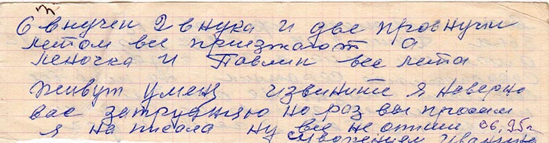 Фотографий у нас ни с отцом ни с мамой нет ни смогли сберечь у мачехи может и были она давно умерла, а брата Володю я не могу найти писала в Шадрино мне ответили что Якушевы выехали в Красноярск а Володю я не знаю он Моисеев или Якушев. И вот осталась я одна всех похоронила Федор с 18 го года был Даша 20 го я с 22 го Андрей с 24го а маленький Сема с 30го года умер скоропостижно сердечник, ну пока все всю мою жизнь не опишешь пока писала заливалась слезами у меня 4 детей 3 сына и дочки 6 внучек 2 внука и две правнучкилетом все приезжают а Леночка и Павлик все лето живут у меня. Извините я наверно вас затрудняю но раз вы просили я на писала ну все не опишешь