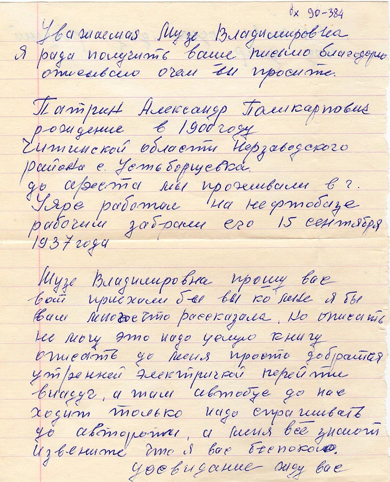 До ареста мы проживали в г. Уяре работал на нефтобазе рабочим забрали его 15 сентября 1937 года.