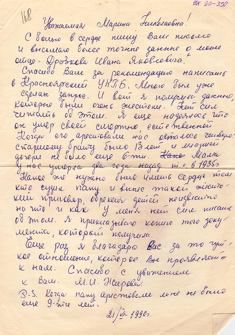 Спасибо Вам за рекомендацию написать в Красноярский УКГБ. Много был уже сделан запрос. И вот я получила данные, которые были очень жестоки. Нет сил читать об этом. Я ещё надеялась, что он умер своей смертью, естественной. Когда его арестовали нас осталось четверо: старшему брату было 13 лет и младшей дочери не было ещё 6-ти. Мама у нас умерла два года назад т.е. в 1935 г.