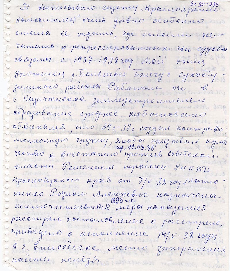 Я выписываю газету «Красноярский комсомолец» очень давно особенно стала ее ждать, где стали печатать о репрессированных чьи судьбы связаны с 1937-1938 год. Мой отец уроженец д. Большой Балчуг Сухобузимского района. Работал он в с. Казачинское землеустроителем образование среднее. Необосновано обвинялся, что 34 г.-37 г. создал контреволюционную группу, якобы призывал кулачество к восстанию (пр. 19.09.38) против Советской власти. Решением тройки УНКВД Красноярского края от 7/V 38 год Матюшенко Родион Алексеевич 1893 г.р. назначена исключительная мера наказания расстрел, постановление о расстреле приведено в исполнение 14/V-38 года в г. Енисейске. Место захоронения найти нельзя. Мы получили свидетельство о смерти первое умер 26/VIII-42 г от рака желудка 11/2-57 год. Второе свидетельство о смерти 21/5-92 год 14/V-38 год расстрелен в возрасте 45 лет.
