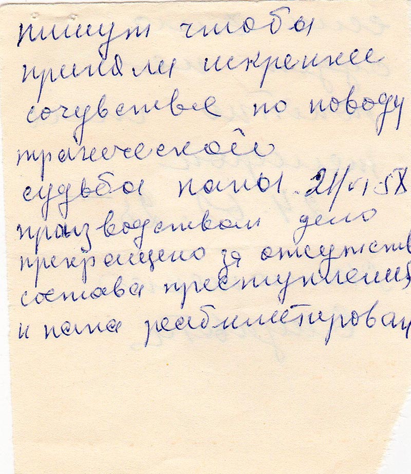 Пишут чтобы чтобы приняли искреннее сочувствие по поводу трагической судьбы папы. 21/VI-58 г. производством дело прекращено за отсутствием состава преступления и папа реабилитирован.