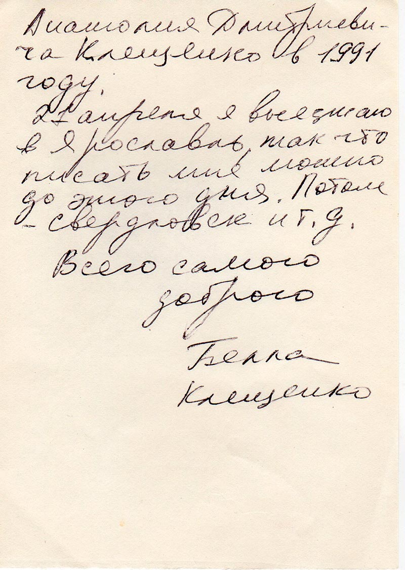 Сообщаю членам «Мемориала», что в конце мая буду в Красноярске. Прошу сообщить, кто из членов «Мемориала» мог бы со мной поехать в места, где отбывал ссылку мой муж Анатолий Клещенко.