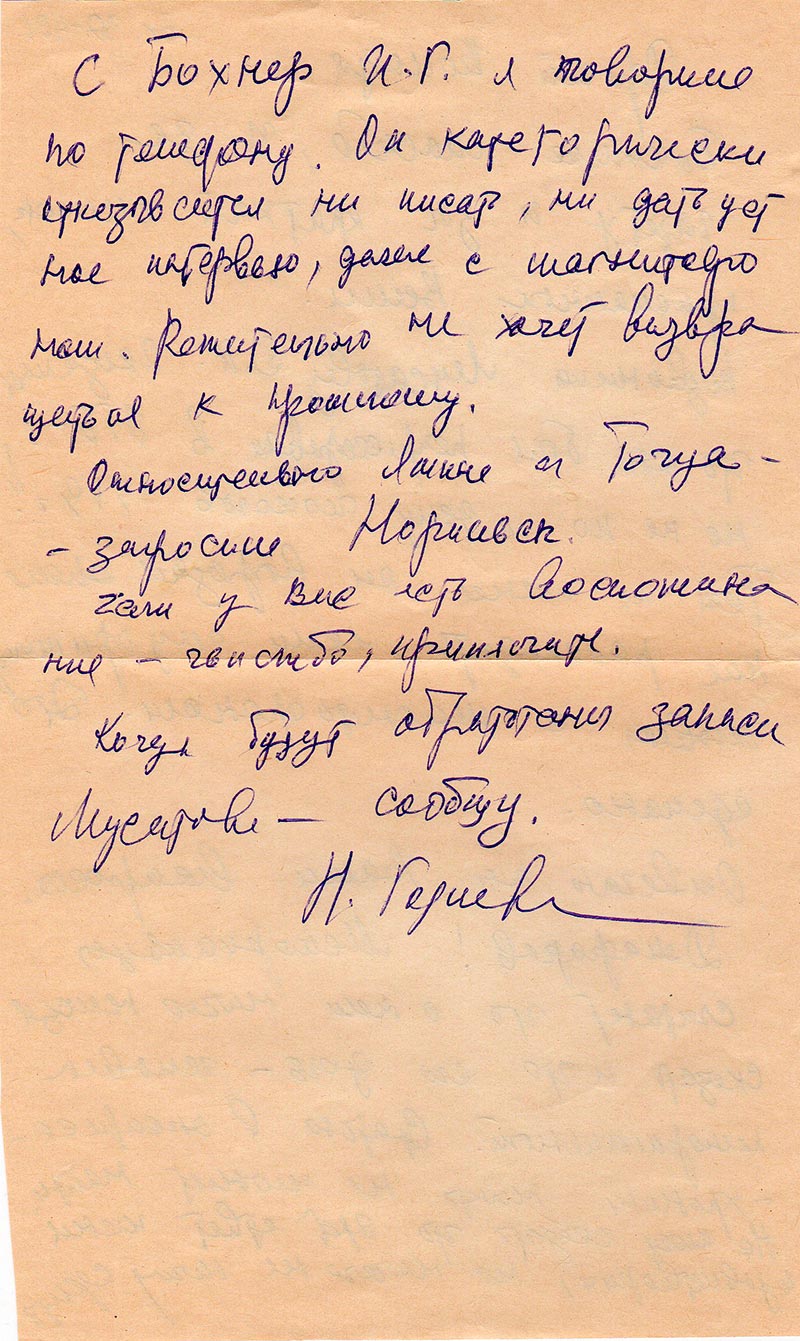 С Бохнер И.Г. я говорила по телефону. Он категорически отказывался ни писать, ни дать устное интервью, даже с магнитофоном. Решительно не хочет возвращаться к прошлому.