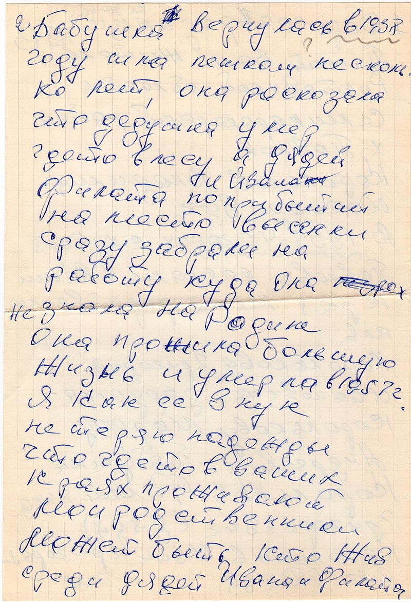 Бабушка вернулась в 1938 году шла пешком несколько лет, она раскозала что дедушка умер гдето в лесу а дядей Филата и Ивана по прибытии на место выселки сразу забрали на работу куда она не знала. На Родине она прожила большую жизнь и умерла в 1957 г. Я как ее внук не теряю надежды что гдето в ваших краях проживают мои родственники. Может быть, кто жив среди дядей Ивана и Филата или может остались их жены (их могла унести война) может есть дети внуки