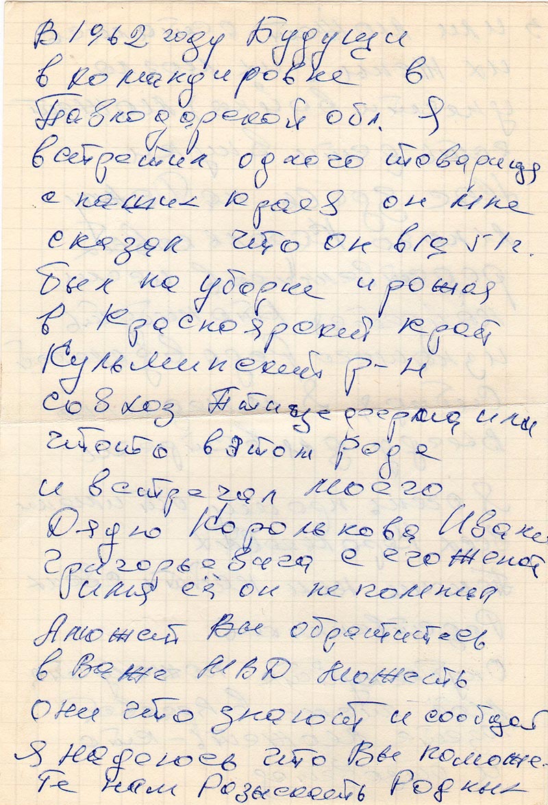 В 1962 году Будущи в командировке в Павлодарской обл. Я встретил одного товарища с наших краев он мне сказал что он в 1951 г. был на уборке урожая в Красноярскей крае Кульминский р-н совхоз Птицеферма или чтото в этом роде и встречал моего Дядю Королькова Ивана Григорьевича с его женой имя её он не помнил