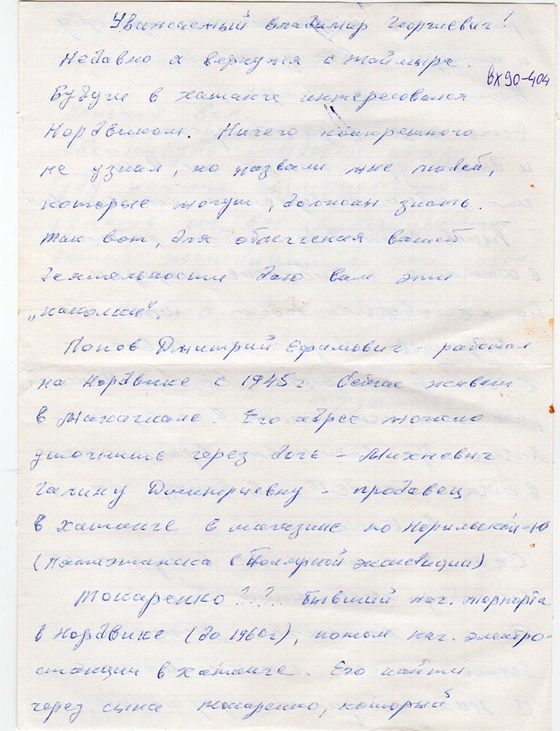 Попов Дмитрий Ефимович работал на Нордвике с 1945 г. Сейчас живет в Махачкале. Его адрес можно уточнить через дочь – Михневич Галину Дмитриевну- продавец в Хатанге в магазине по Норильской-ю (пятиэтажка?? Полярной экспедиции).