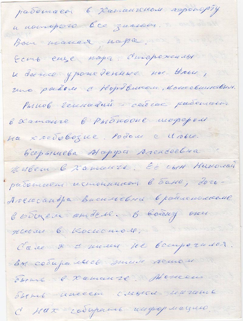 Барышева Марфа Алексеевна. Живет в Хатанге. Ее сын Николай работает истопником в бане, дочь – Александра Васильевна в райисполкоме в общем отделе. В войну они жили в ???