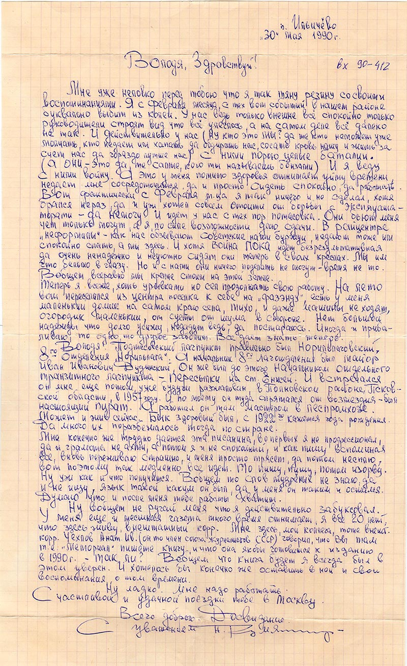 Ну вобщем не ругай меня что я действительно забуксовал. У меня еще и местная газета много время отнимает, я все 20 лет, что здесь живу, внештатный корр. Мне здесь, мой коллега, тоже внешт. корр. Чехлов Анат. Ив. ( он то член союза журналистов СССР ) говорил, что Вы там т. е. «Мемориал» пишете книгу, и что она якобы готовится к изданию в 1990 г. – ТАК ЛИ? Вобщем что книга будет я всегда был в этом уверен. И хотелось бы конечно же оставить в ней и свои воспоминания о том времени.