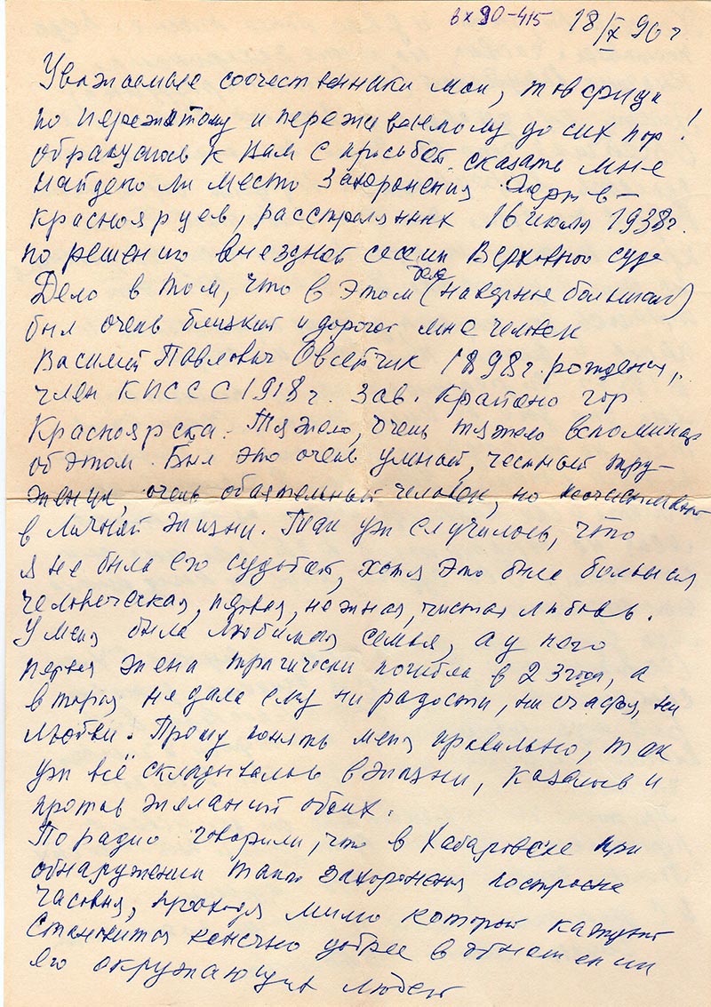 Уважаемые соочественники мои, товарищи по пережитому и переживаемому до сих пор! Обращаюсь к Вам с просьбой сказать мне найдено ли место захоронения жертв – красноярцев, расстрелянных16 июля 1938г. по решению выездной сессии Верховного суда.