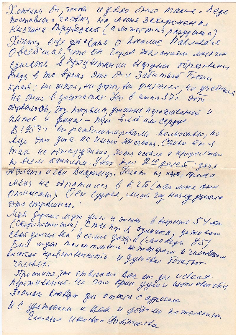 Дело в том, что в этом деле (наверное большом) был очень близкий и дорогой мне человек Василий Павлович Овсейчик 1898 г. рождения, член КПСС с 1918 г. Зав. Крайоно гор. Красноярска. Тяжело, очень тяжело вспоминать об этом. Был это очень умный, честный труженик, очень обаятельный человек, но несчастливым в личной жизни. Так уж случилось, что я не была его судьбой, хотя это была больная человеческая, первая, нежная, чистая любовь.