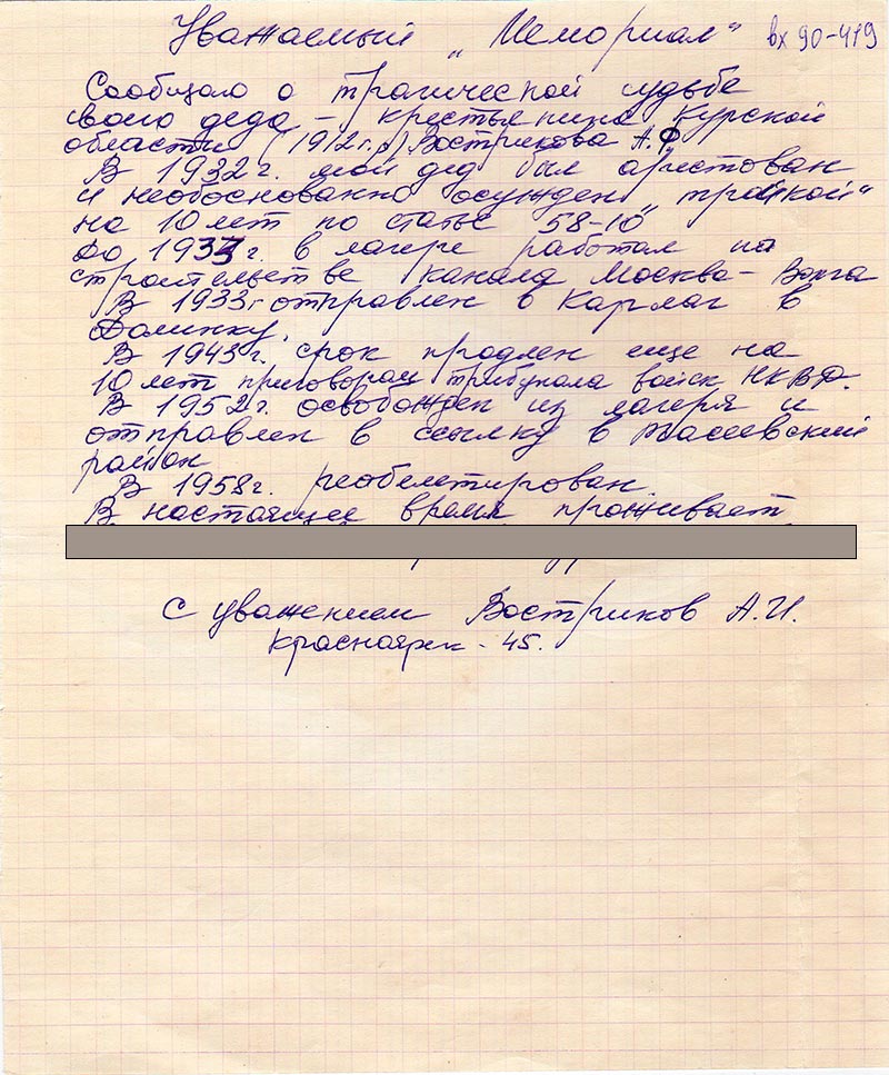 Сообщаю о трагической судьбе своего деда – крестьянина Курской области (1912 г.р.) Вострикова А. Ф.