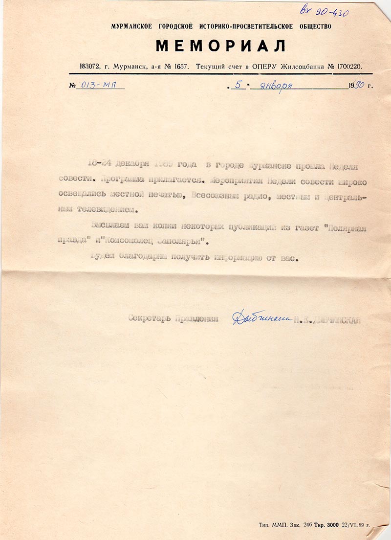 18-24 декабря 1989 года в городе Мурманске прошла Неделя совести. Программа