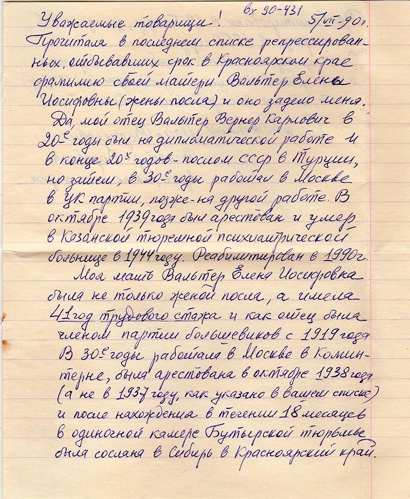 Прочитала в последнем списке репрессированных отбывавших срок в Красноярском крае фамилию своей матери Вальтер Елены Иосифовны (жены посла) и оно задело меня. Да, мой отец Вальтер Вернер Карлович в 20-е годы был на дипломатической работе и в конце 20-х годов послом СССР в Турции, но затем в 30-е годы работал в Москве в ЦК партии, позже – на другой работе. В октябре 1939 года был арестован и умер в Казанской тюремной психиатрической больнице в 1944 году. Реабилитирован в 1990 г.