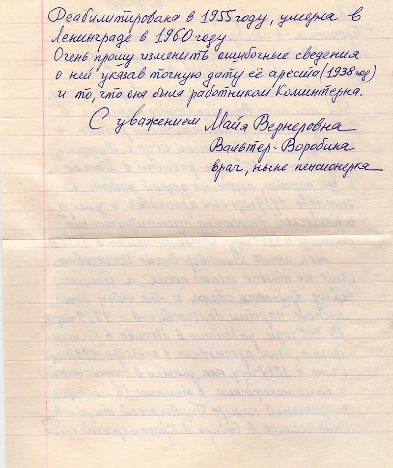 Моя мать Вальтер Елена Иосифовна была не только женой посла, а имела 41 год трудового стажа и как отец была членом партии большевиков с 1919 года. В 30-е годы работала в Москве в Коминтерне, была арестована в октябре 1938 года (а не в 1937 году, как указано в вашем списке) и после нахождения в течении 18 месяцев в одиночной камере Бутырской тюрьмы была сослана в Сибирь в Красноярский край. Реабилитирована в 1955 году, умерла в Ленинграде в 1960 году.