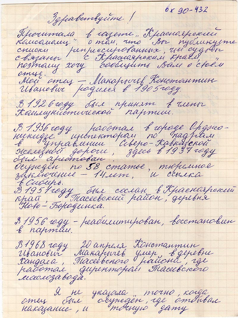 Прочитала в газете «Красноярский комсомолец» о том, что Вы публикуете списки репрессированных, чьи судьбы связаны с Красноярским краем, поэтому хочу сообщить Вам о своём отце.