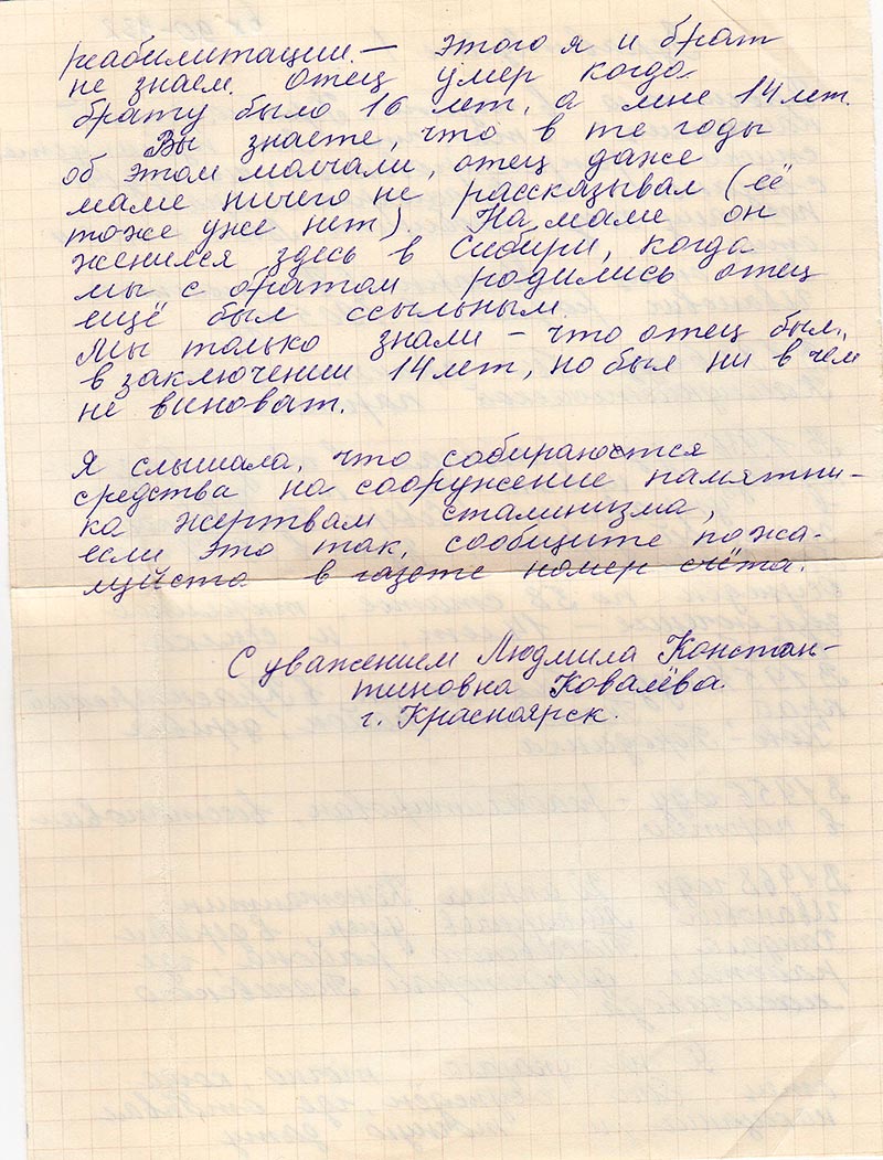 Я не указало точно, когда отец был осужден, где отбывал наказание, и точную дату реабилитации – этого я и брат не знаем. Отец умер когда брату было 16 лет, а мне 14 лет.
