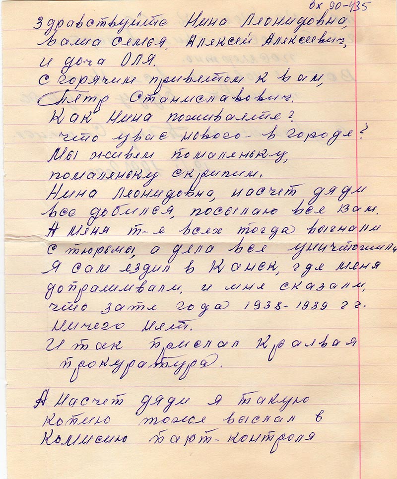 Нина Леонидовна, насчет дяди все добился, посылаю все Вам. А меня т.е. всех тогда Выгнали с тюрьмы, а дела все уничтожили. Я сам ездил в Канск, где меня допрашивали, и мне сказали, что за те года 1938-1939 гг. ничего нет.