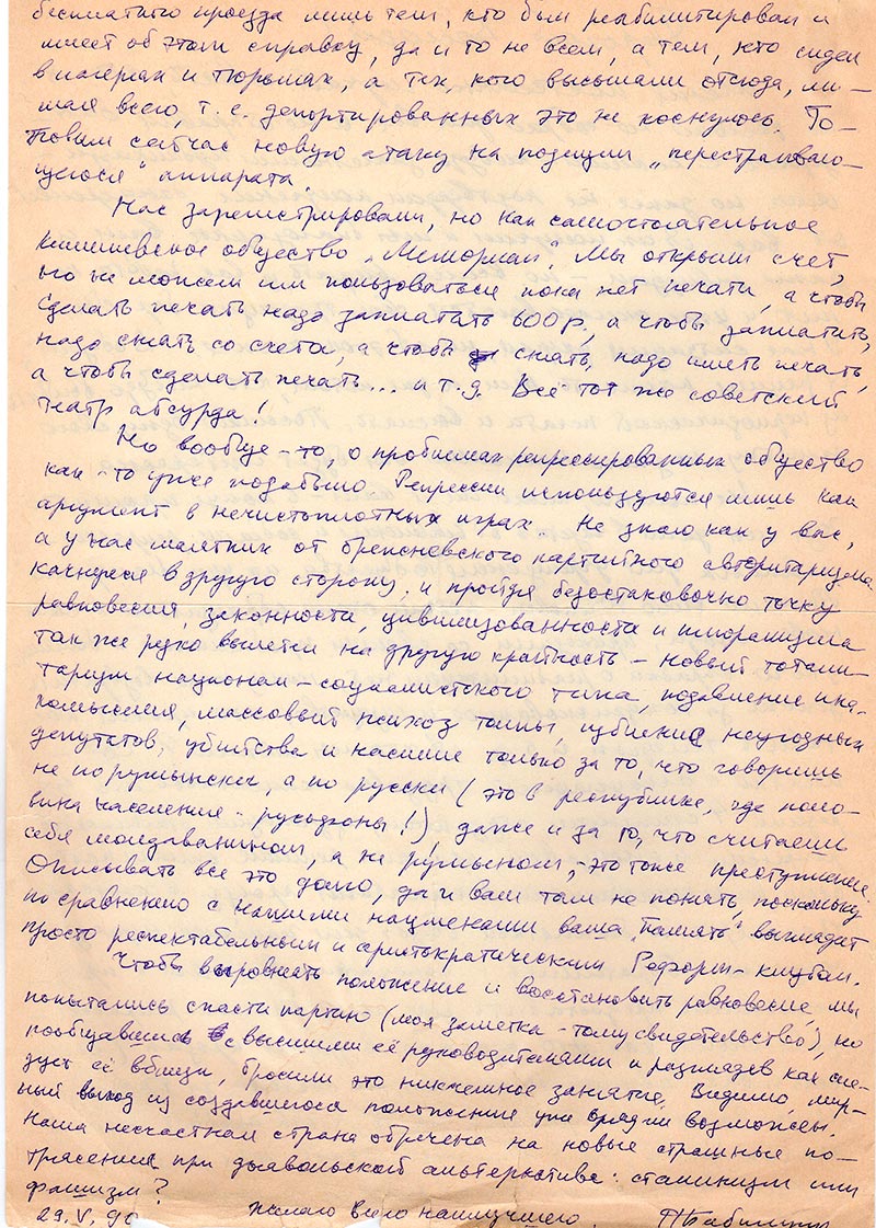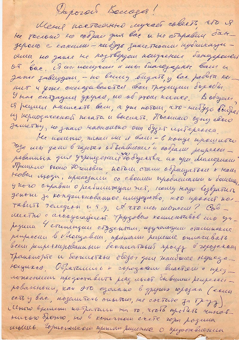 Меня постоянно мучает совесть, что я не только не собрал для вас и не отправил бандероль с какими-нибудь заметными публикациями, но даже не подтвердил получение бандеролей от вас. Я их получил и мы благодарны вам, и даже завидуем, - по всему видать, у вас работа кипит и уже складаваются свои традиции борьбы. У нас ситуация другая, но об этом ниже. А общем, я решил написать вам, а уже потом, что-нибудь выбрать из периодической печати и выслать.