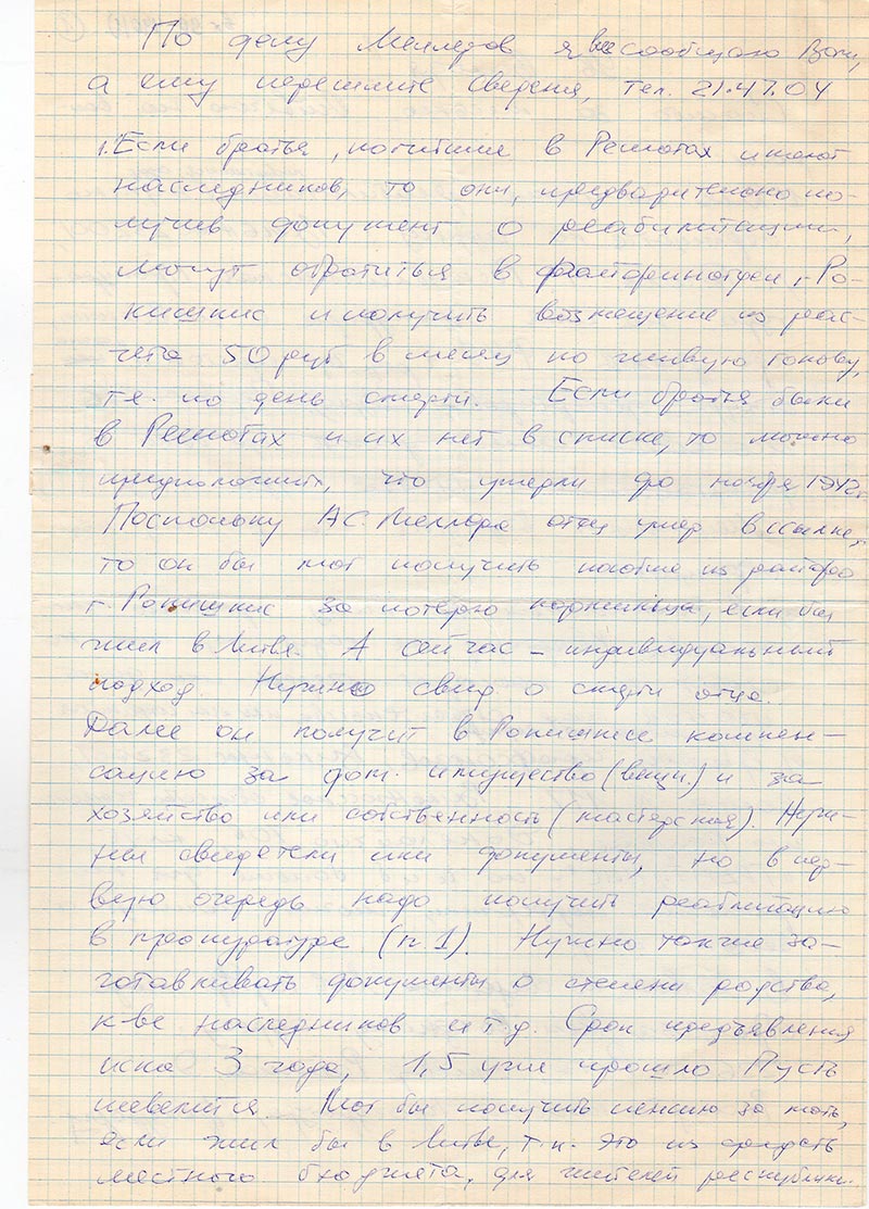 Чтобы было побыстрее Меллеру А.С., он о судьбе дядей может справится в спец.отделе в Решотах, там все скажут и справку дадут, только она не будет годиться для имущественных дел в Литву, а только в семейный архив. Вот так.