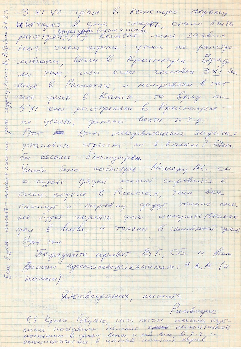 Спасибо за письмо и газету. Многократно более благодарю за заявления Красноярского Мемориала Литвы! Как только доберусь до своего, тутошнего клуба б. с/переселенцев и проч. и проч. (много бываю в командировках, вечно отсутствую на заседаниях). Поставлю вопрос об официальном слове СПАСИБО Вам всем за поддержку. Оно, Ваше письмо, было ????Низ письма обрезан