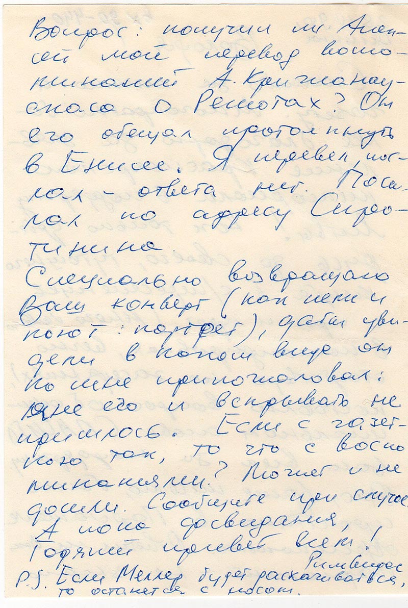 Специально возвращаю Ваш конверт (как пели и поют «портрет»), дабы увидели в каком виде он ко мне припожаловал: мне его и вскрывать не пришлось. Если с газеткою так, то что с воспоминаниями? Может и не дошли. Сообщите при случае, а пока до свидания. Горячий привет всем.