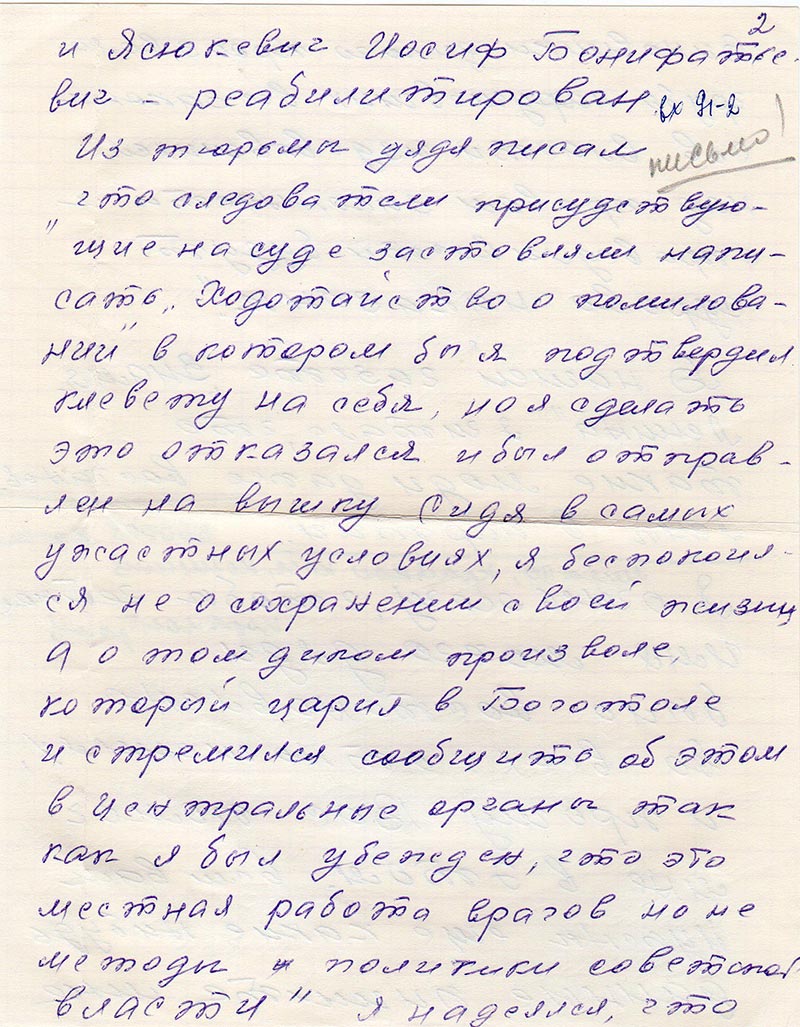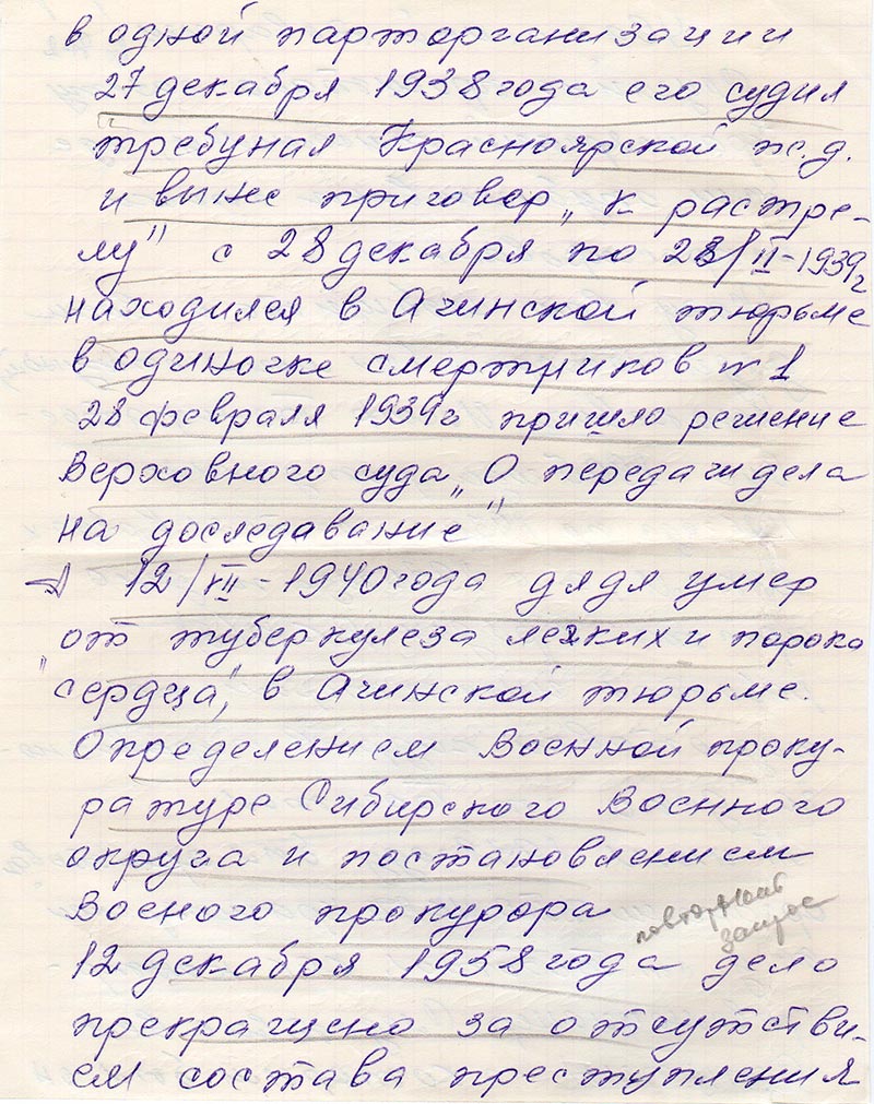 Из тюрьмы дядя писал «что следователи присудствующие на суде заставляли написать «Ходатайство о помиловании» в котором бы я подтвердил клевету на себя, но я сделать это отказался и был отправлен на вышку. Сидя в самых ужасных условиях, я беспокоился не о сохранении своей жизни, а о том диком произволе, который царил в Боготоле и стремился сообщить об этом в Центральные органы так как я был убежден, что это местная работа врагов но не методы и политики советской власти». Я надеялся, что виновники дикого произвола грубо нарушевших все законы сов. власти издевавшихся над правом законности и справедливости будут сурово наказаны».