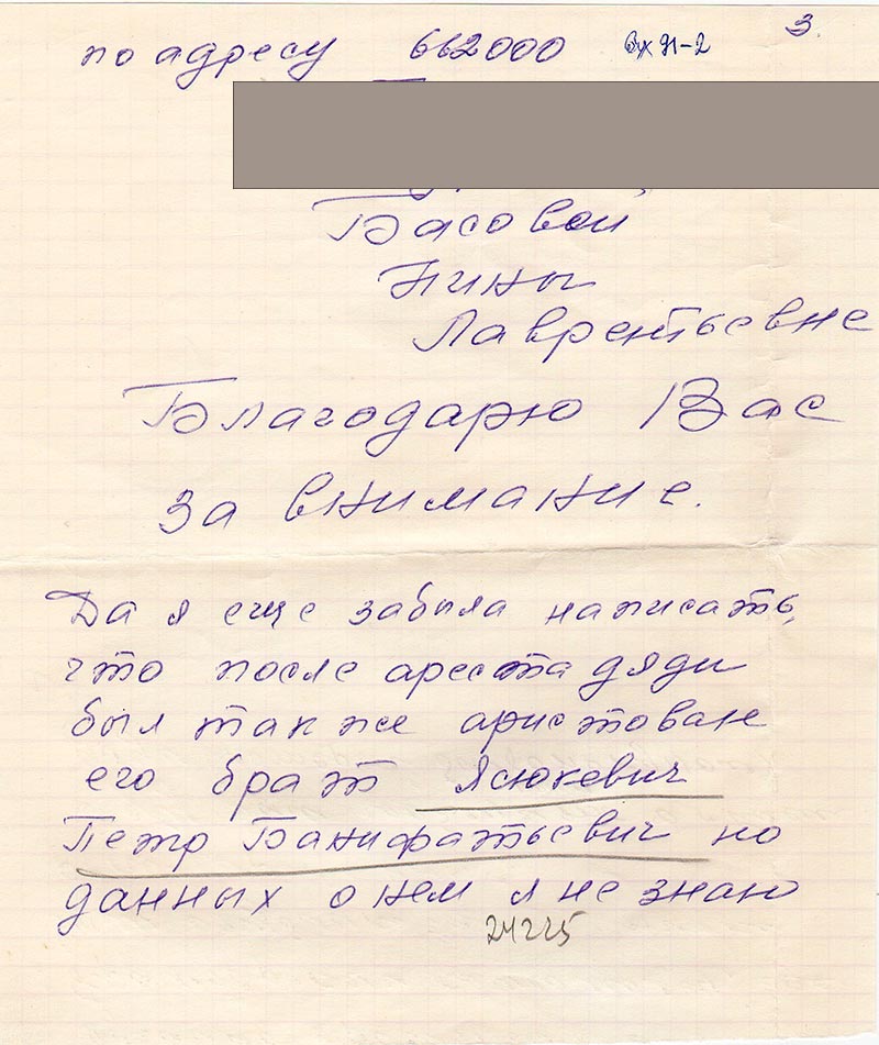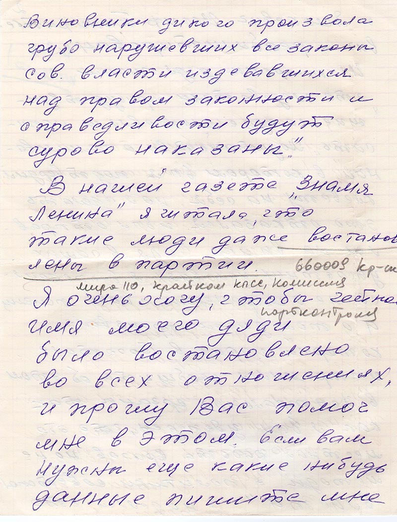 Я очень хочу, чтобы честное имя моего дяди было востановлено во всех отношениях, и прошу Вас помоч мне в этом. Если вам нужны еще какие нибудь данные пишите мне по адресу…