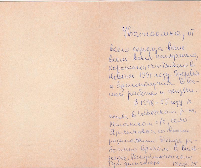 Уважаемы, от всего сердца вам всем всего наилучшего, хорошего, счастливого в Новом 1991 году. Здоровья и благополучия в вашей работе и жизни.