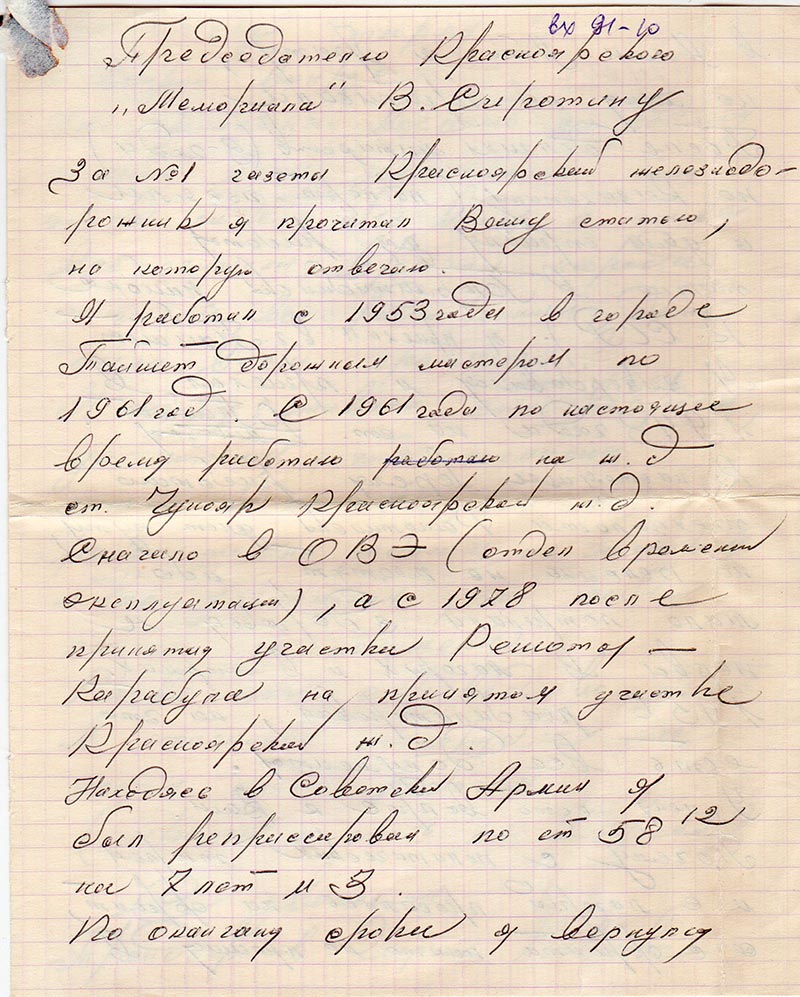 Находясь в Советской армии я был репрессирован по статье 58.12 на 7 лет и 3 месяца. По окончании срока я вернулся в Алма-Аты к брату, но меня не приписали. После долгих мытарств 3 года по Казахстану (паспорт изъяли, а дали справку для работы только в Бурлю-Тобинском районе КССР). Я приехал в Тайшет. Я завербовался и приехал в 1943 году на станцию Тайшет.