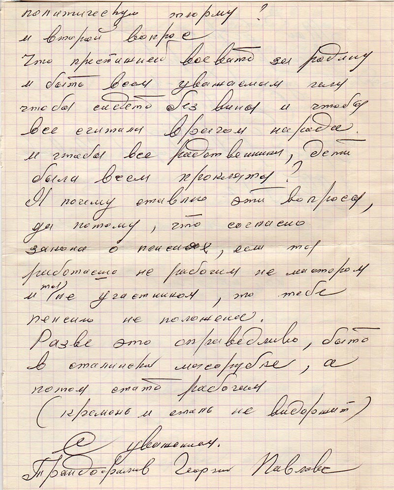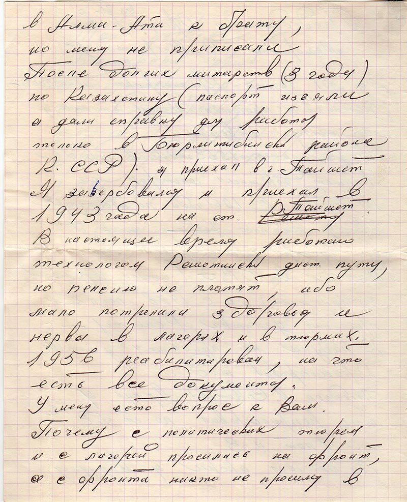 В настоящее время работаю технологом Ришотинских дист. пути, но пенсию не платят, ибо мало потрепали здоровья и нервы в лагерях и тюрьмах.