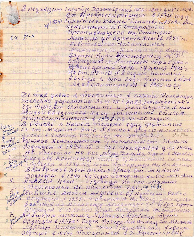Не так давно я прочитал в газете Красноярс. Железнодрожник за № 45 (7073) «Мемориал» где просят вспомнить и помянуть. Я как живой свидетель хочу дополнить список репрессированных в 1937-38-40-50 годах.