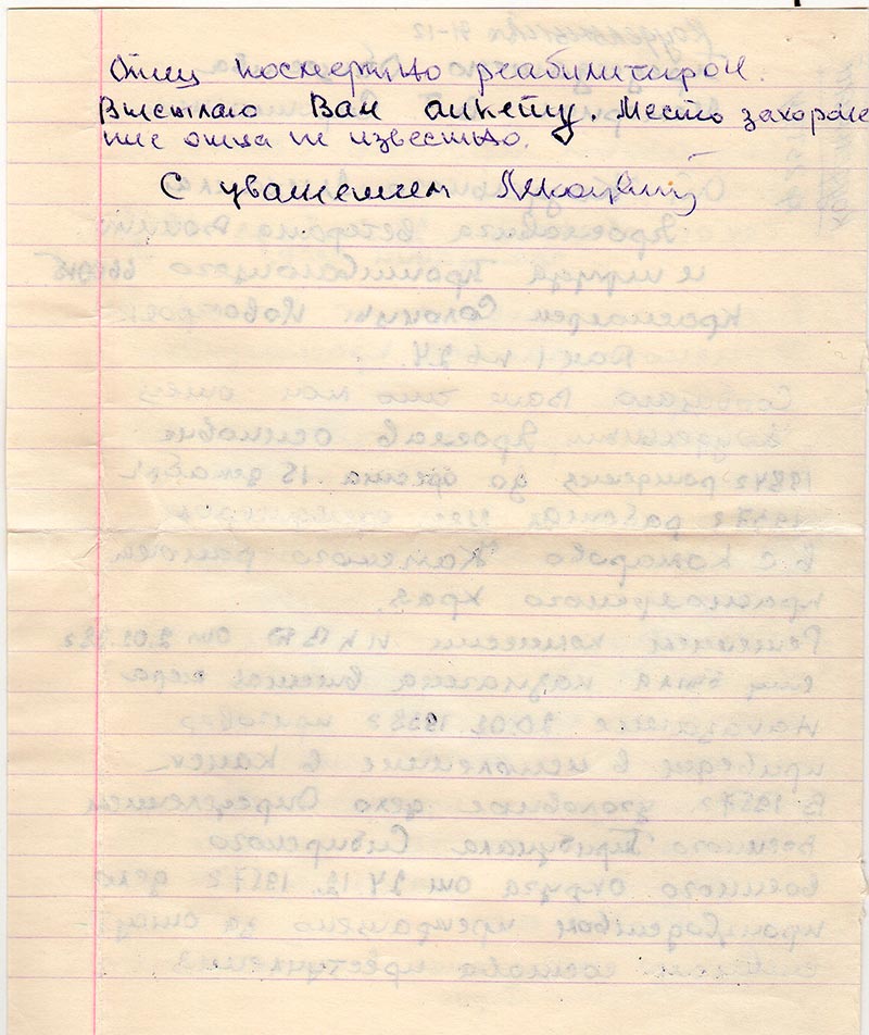 Отец посмертно реабилитирован. Высылаю вам анкету. Место захоронения отца не известно.
