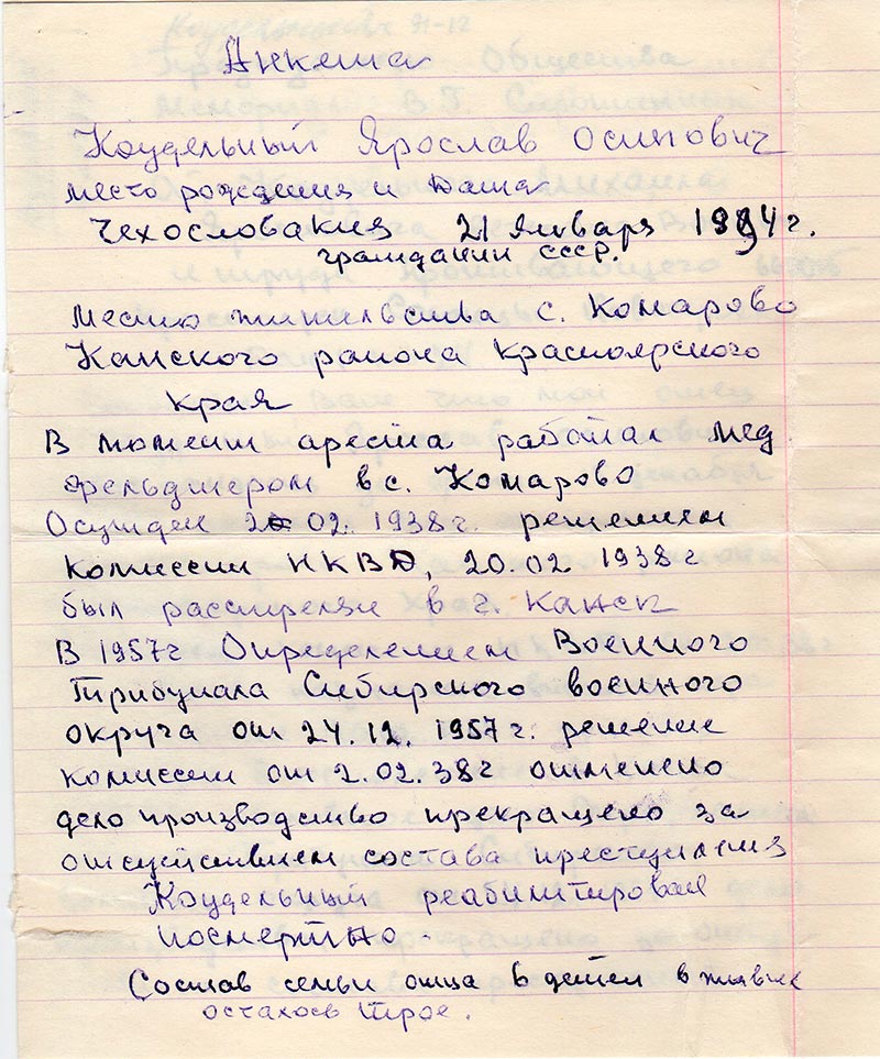 Сообщаю Вам что мои отец Коудельный Ярослав Осипович 1984 г. рождения до ареста 15 декабря 1937 г. работал мед. фельдшером в с. Комарово Канского района Красноярского края.