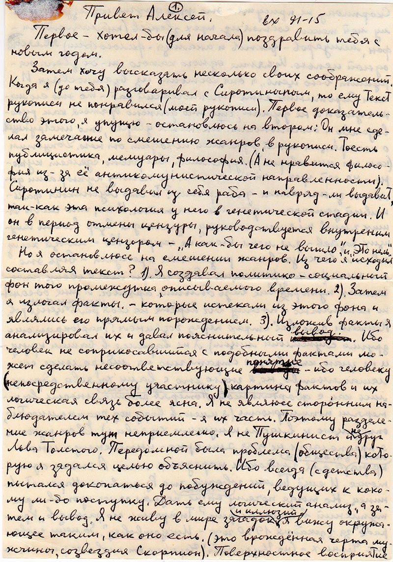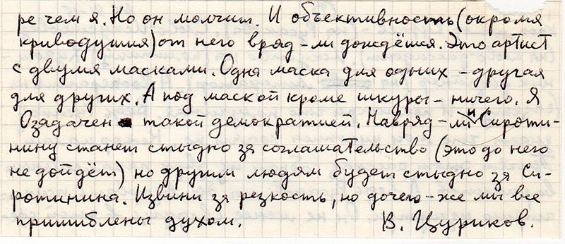Затем хочу высказать несколько своих соображений. Когда я (до тебя) разговаривал с Сиротининым, то ему Текст рукописи не понравился (моей рукописи). Первое доказательство этого, я упущю – остановлюсь на втором: Он мне сделал замечание по смешению жанров, в рукописи. То есть публицистика, мемуары, философия. (А не нравится философия из-за её антикоммунистической направленности). Сиротинин не выдавил из себя раба – и навряд-ли выдавит, так-как эта психология у него в генетической стадии. И он в период отмены цензуры, руководствуется внутренним генетическим цензором – «А как-бы чего не вышло», и «Это нель».