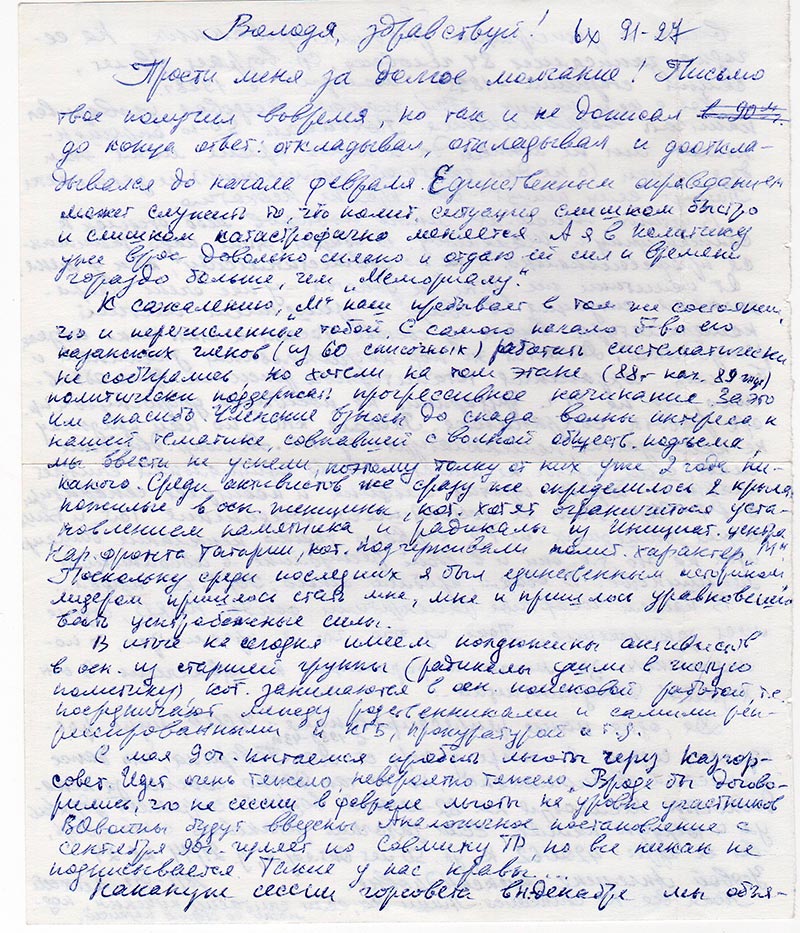 Прости меня за долгое молчание! Письмо твое получил вовремя, но так и не дописал в 90м г. до конца ответ: откладывал, откладывал и дооткладывался до начала февраля. Единственным оправданием может служить то, что полит. ситуация слишком быстро и слишком катастрофично меняется. А я в политику уже врос довольно сильно и отдаю ей сил и времени гораздо больше, чем «Мемориалу».