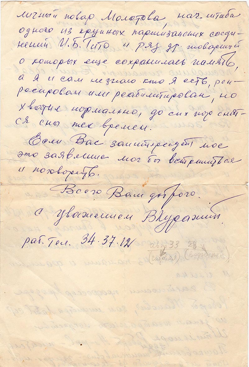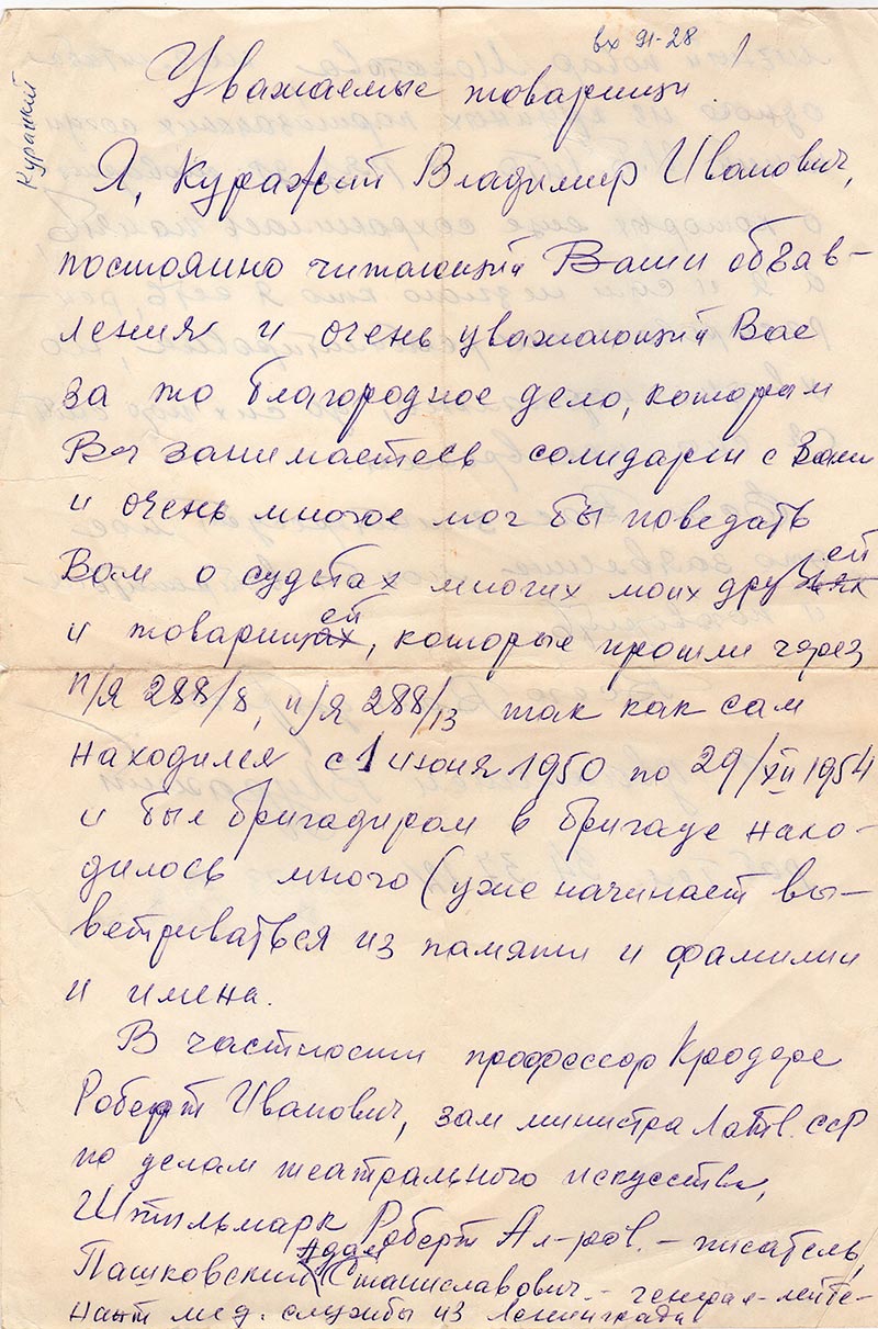 Я, Куражий Владимир Иванович, постоянно читающий Ваши объявления и очень уважающий Вас за то благородное дело, которым Вы занимаетесь солидарен с Вами и очень многое мог бы поведать Вам о судьбах многих моих друзей и товарищей, которые прошли через п/я 288/8, п/я 288/13 так как сам находился с 1 июня 1950 по 29/XII 1954 и был бригадиром в бригаде находилось много (уже начинает выветриваться из памяти и фамилии и имена.