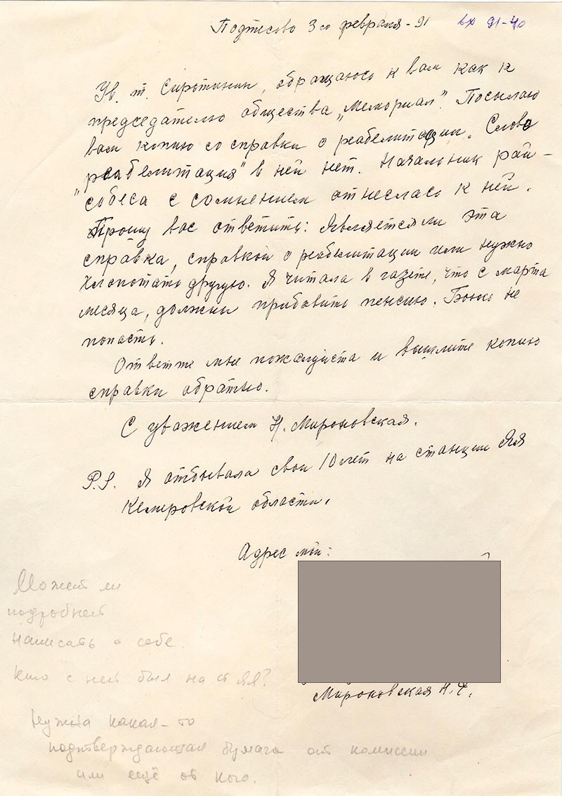 Ув. т. Сиротинин, обращаюсь к вам как к председателю общества «Мемориал». Посылаю вам копию со справки о реабилитации. Слова «реабилитация» в ней нет. Начальник райсобеса с сомнением отнеслась к ней.