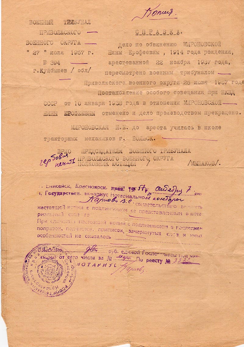 Дело по обвинению МИРОНОВСКОЙ Нины Ерофеевны, 1914 года рождения, арестованной 22 ноября 1937 года, пересмотрено военным трибуналом Приволжского военного округа 26 июля 1957 года.