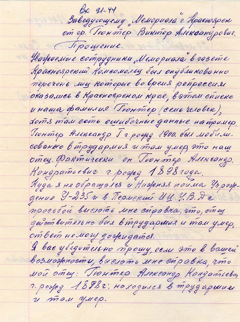Уважаемы сотрудники «Мемориала» в газете «Красноярский комсомолец» был опубликовано перечень лиц, которые во время репрессии оказались в Красноярском крае, в этом списке и наша фамилия Гюнтер (семь человек), хотя там есть ошибочные данные например Гюнтер Александр Г. г. рожд. 1900 был мобилисованно в трудармия и там умер, это наш отец. Фактически он Гюнтер Александр Кондратьевич г. рожд. 1898 года.