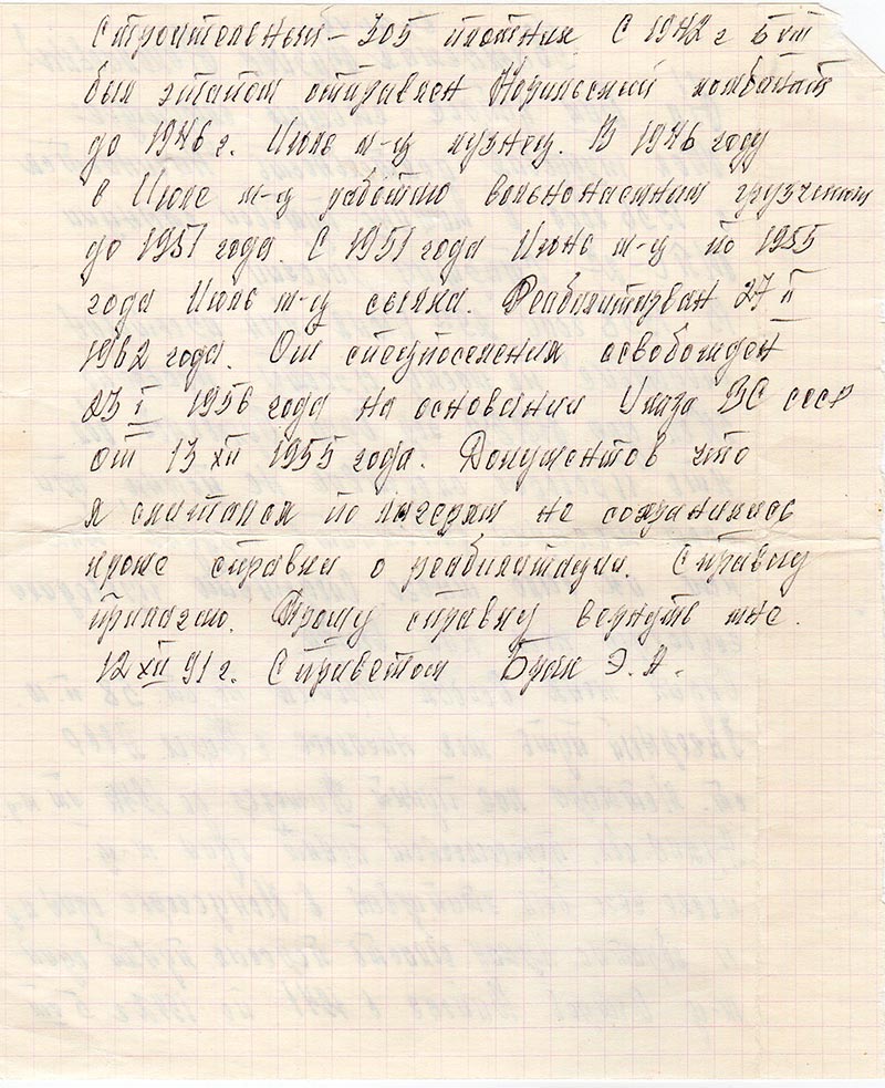 Реабилитирван 27 II 1962 года. От спецпоселения освобожден 23.I.1956 года на основании Указа ВС СССР от 13 XII 1955 года. Документов что я скитался по лагерям не сохранились кроме справки о реабилитации. Справку прилагаю. Прошу справку вернуть мне.