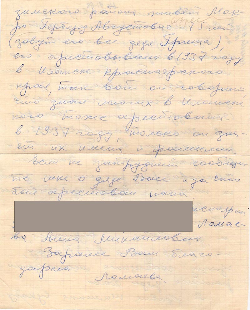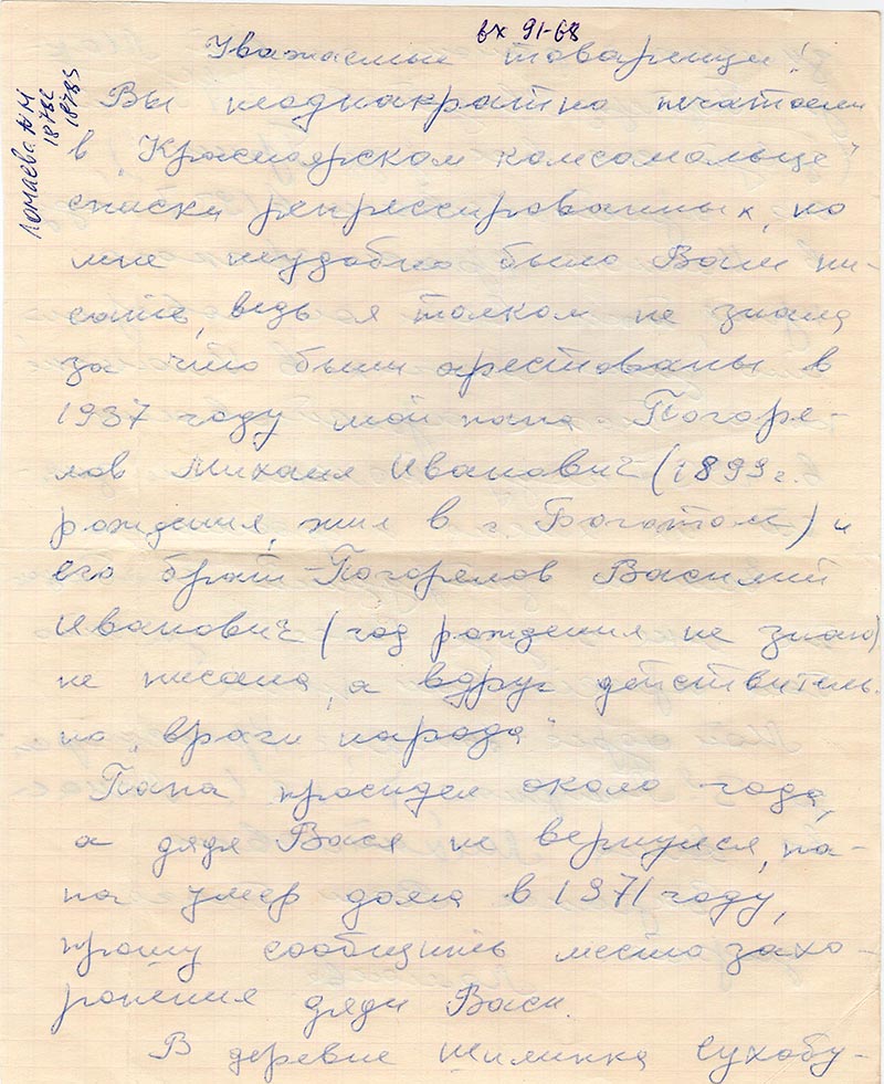 Вы неоднакратно печатали в «Красноярском комсомольце» списки репрессированных, но мне неудобно было Вам писать, ведь я толком не знала за что были арестованы в 1937 году мой папа Погорелов Михаил Иванович (1899 г. рождения жил в г. Боготоле) и его брат – Погорелов Василий Иванович (год рождения не знаю) не писала, а вдруг действительно «враги народа».