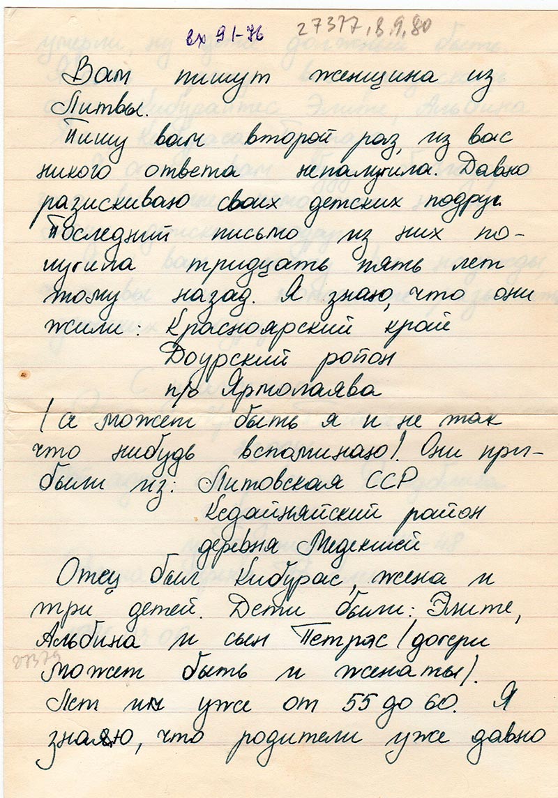 Пишу вам во второй раз, из вас никакого ответа не получала. Давно разыскиваю своих детских подруг. Последнее письмо из них получила тридцать пять лет тому назад. Я знаю, что они жили: Красноярский край, Доурский раойн п/о Ярмолаява (а может быть я и не так что-нибудь вспоминаю). Они прибыли из: Литовская ССР, Кедайнянский район деревня Медекшей.