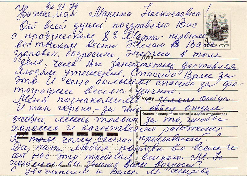 От всей души поздравляем Вас с праздником 8е Марта – первым вестником весны. Желаю Вам здоровья, бодрости, энергии в том деле, чем Вы занимаетесь, доставляя людям утешение. Спасибо Вам за это. И еще большое спасибо за фотографии весьма удачные. Меня познакомили с делом отца. И так горько – за что отец отдал жизнь, лишь только за то, чтобы хорошо и качественно работали. К чему сейчас призываем. Да, папа любил порядок во всем и от нас это требовал строго. М.Н. хотелось бы знать Ваш возраст?