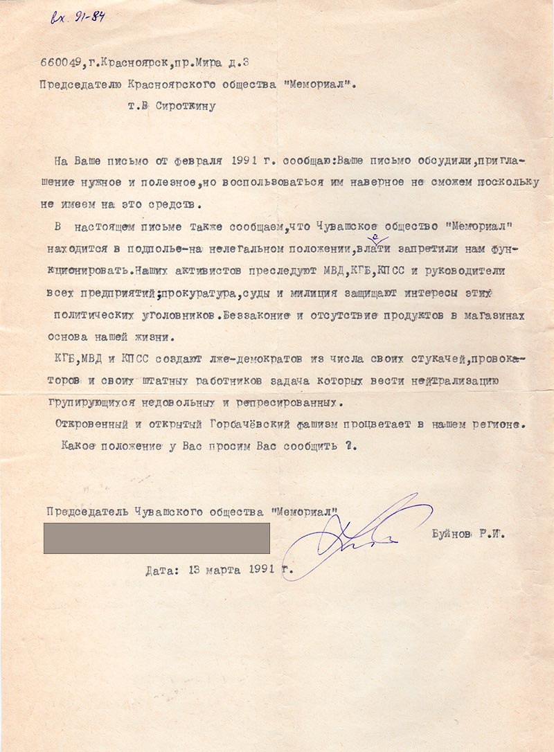 В настоящем письме также сообщаем, что Чувашское общество «Мемориал» находится в подполье – на нелегальном положении, власти запретили нам функционировать. Наших активистов преследуют МВД, КГБ, КПСС и руководители всех предприятий; прокуратура, суды и милиция защищают интересы этих политических уголовников. Беззаконие и отсутствие продуктов в магазинах основа нашей жизни.