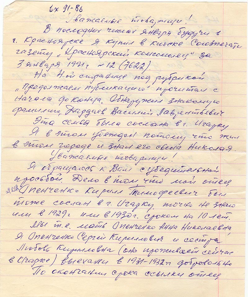Я обращаюсь к Вам с убедительной просьбой. Дело в том, что мой отец Опенченко Кирилл Тимофеевич был тоже сослан в г. Игарку. Точно не знаю или в 1929 г. или в 1930 г. сроком на 10 лет.